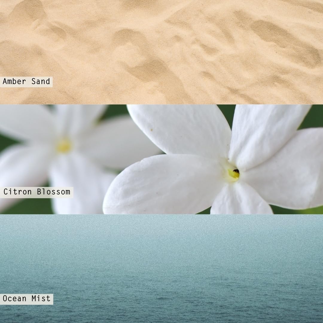 This scent is grounded in amber sand with a heart of citron blossom kissed with ocean mist