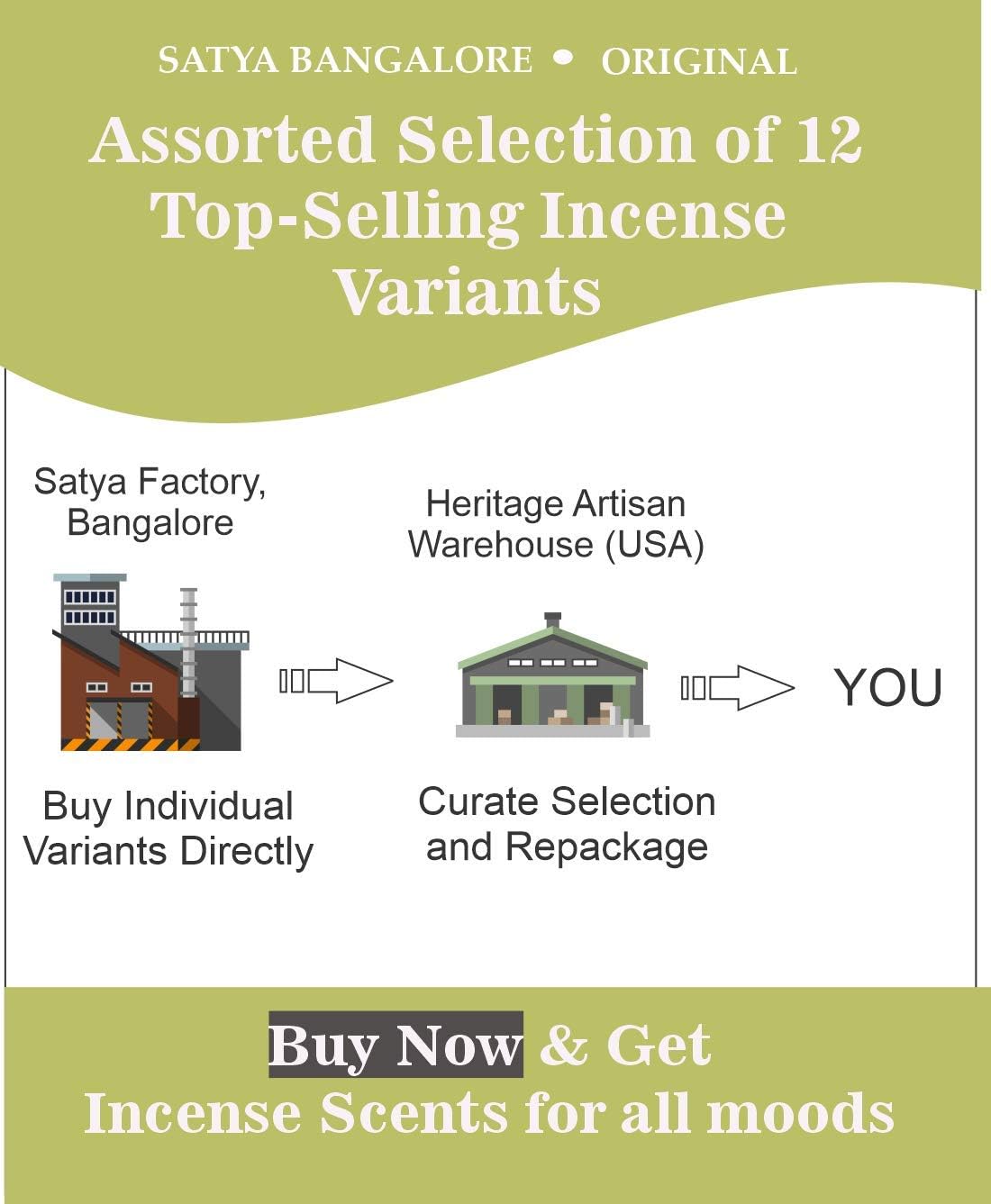 100 Percent NATURAL INCENSE STICKS (NON TOXIC) HANDROLLED using tural resins, herbs, aromatic wood powder and charred coconut at Satya Bangalore Factory : All individual variants are sourced directly from Satya and then variety pack is created by us.